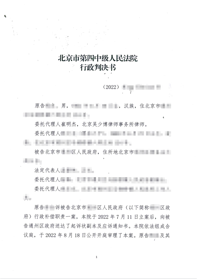 本案代理律師:北京吳少博律師事務所吳少博律師、石磊律師 本案事實 被告TS區(qū)政府于2019 年